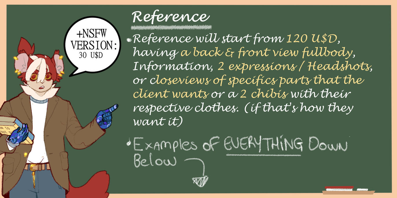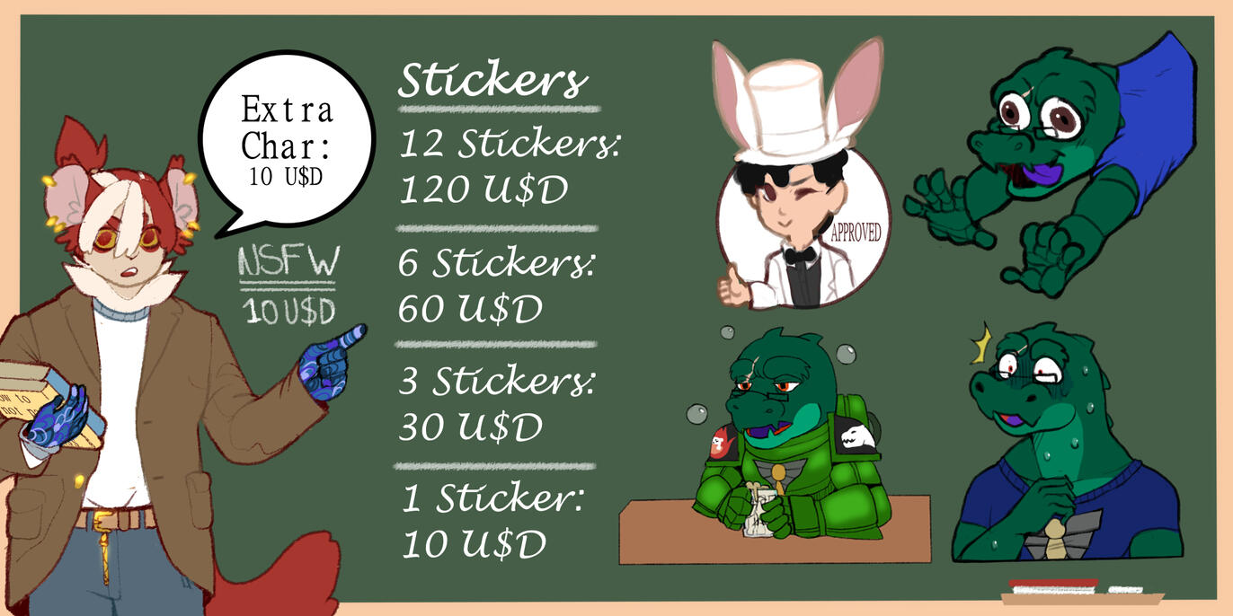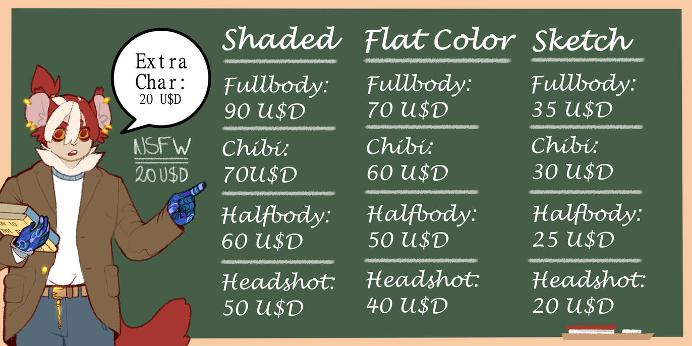 Any tiny extra art like; expressions (Headshots), Halfbodie, Chibi, or zoom in details are going to be 20 U$D added.For any bigger extra addition, like fullbodies is 50 U$D.
